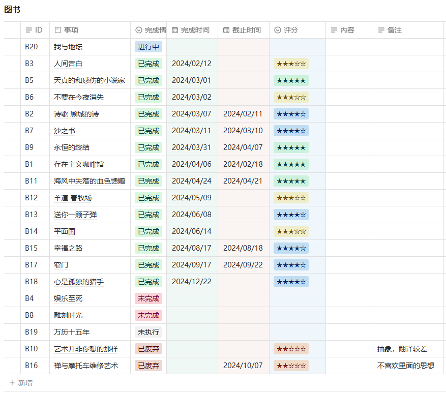 由于今年欲望订单被细分,关于今年的读书情况通过这个表格一目了然。