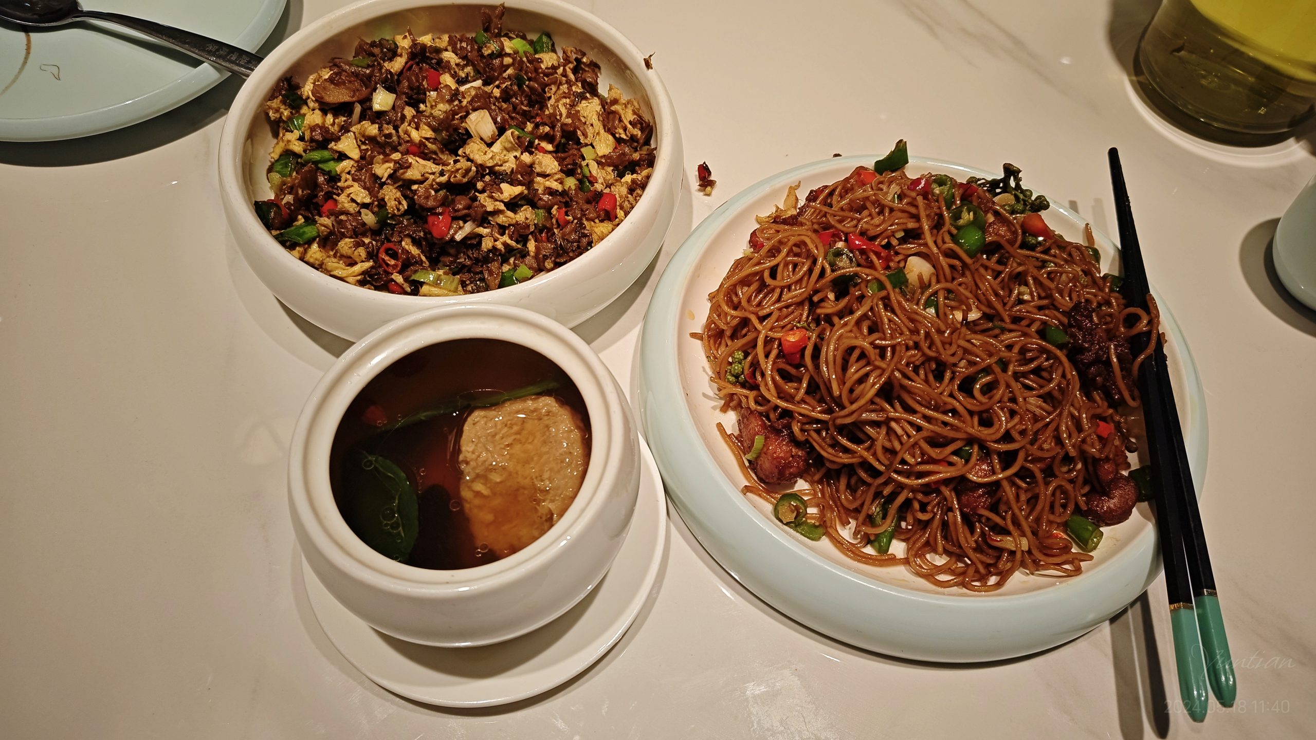 一个人,总归点了3个菜,狮子头,双椒鸡捞面,还有一个外婆菜炒鸡蛋。