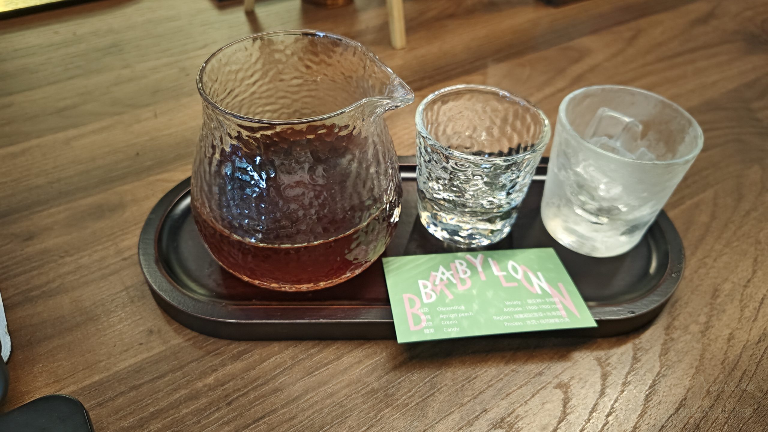 一个琉璃壶和两小盏琉璃杯,分别是加热杯和冰块杯。在手冲之前老板会将磨好的豆放在顾客面前闻香,如果没有对比我是闻不出什么特别的东西的,只是感觉香味很醇厚,绝不会太苦。但冲好的咖啡闻起来桂花味十足,咖啡豆应该是浅度烘焙,酸感明显但适中,略有一些果香。卡片上说香味包含"桂花,杏桃,奶油和糖果",桂花和奶油可以感受到,杏桃如果说非要有是在喝过以后的唇齿留香,至于糖果我是完全品尝不到。
