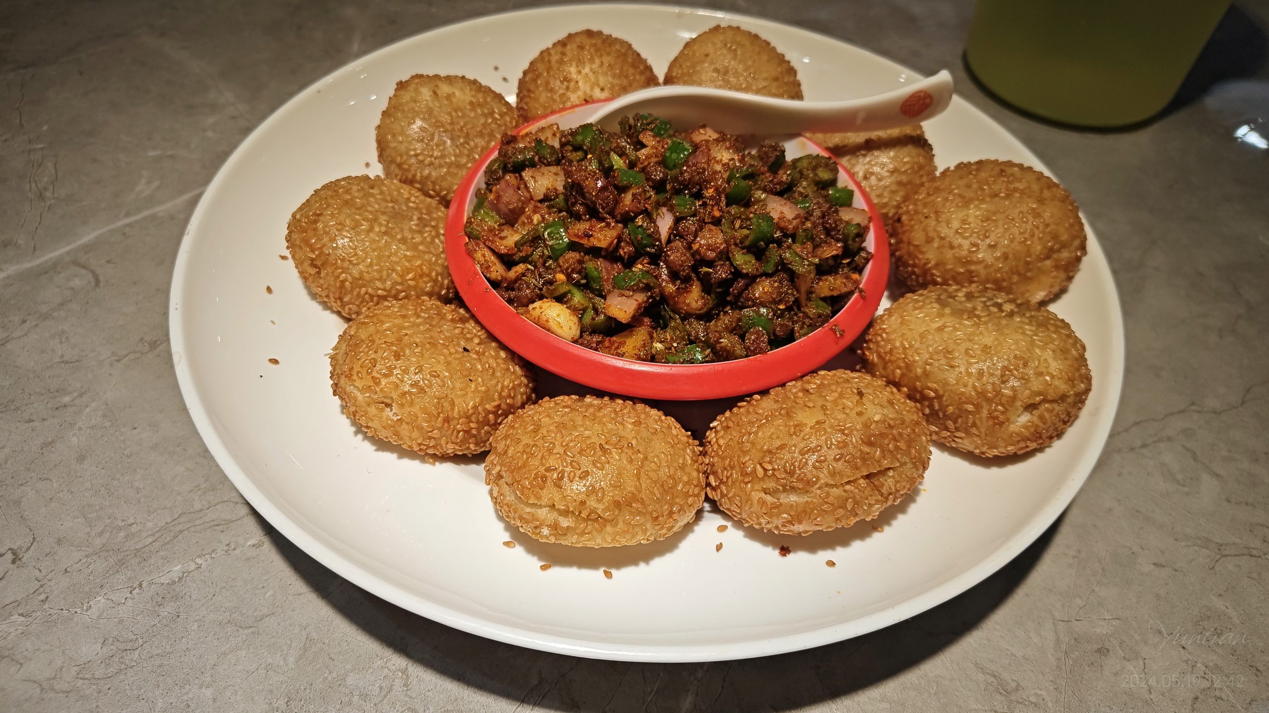 孜然小炒羊肉除了菜以外,一圈金黄的芝麻面饼切好口等待装填。芝麻饼很酥,而孜然小炒羊肉正如字面意思,以小炒肉的做法,不过肉是羊肉并加了孜然。为了让孜然味道明显,羊肉丁切的比较小。很香。