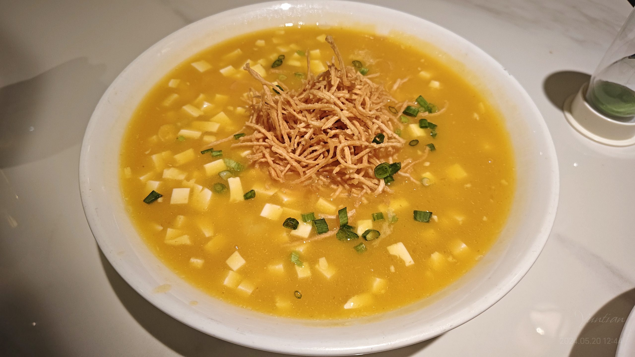 虾仁豆花:非常大一碗,早知道不点米饭了,光喝这个就能喝饱。明亮的金汤本身没什么特别味道,略有鲜味。中间细丝状的东西像炸细麻花的口感,但经过金汤浸泡后筋道又绵软我很不喜欢。虾仁略少,口感脆嫩。方形颗粒豆花很嫩。倒是这道菜意外地解决了酸辣白菜过辣的问题。