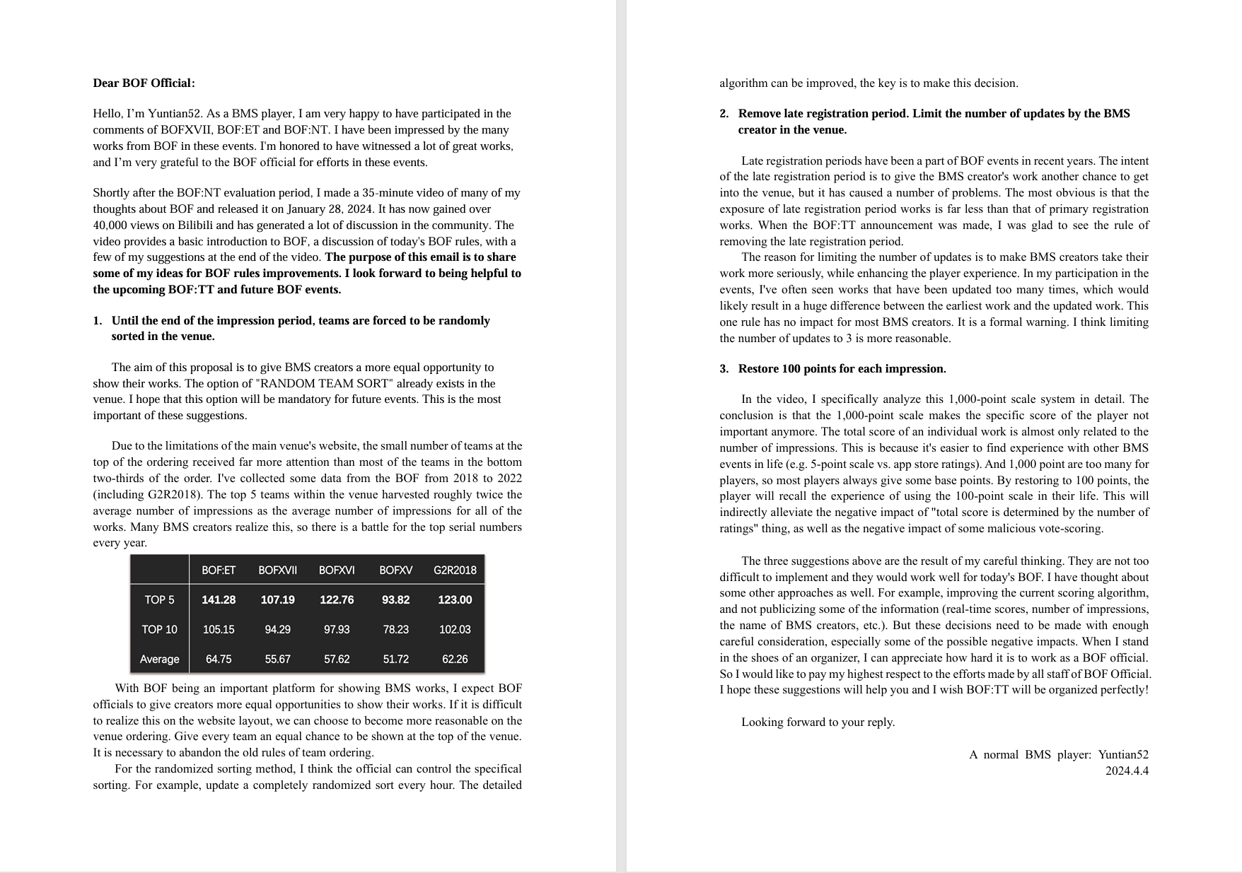 在完成毕设后,4月初我紧接着给BOF官方写了一封信,在说明这期视频影响力的同时给出了我的几条建议。